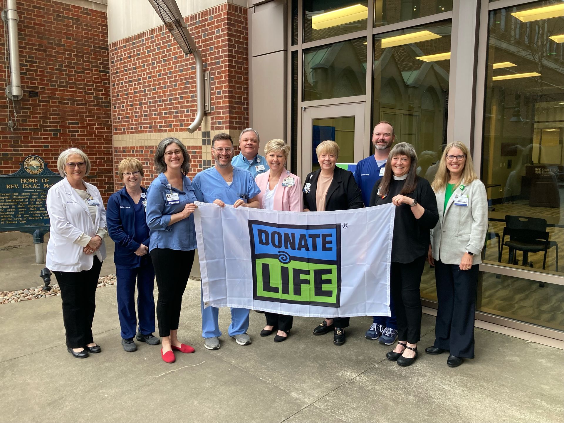 Flag raising - St. Luke's Hospital Flag Raising Ceremony to kick off Donate Life Month (April). Andrew Schlachter, MD (former recipient of the Rising Star Award), myself and members of the SLH Donor Advisory Council, Jani Johnson, CEO SLH; Jane Peck, COO SLH; Jason Purcell, CNO SLH; John Dickerson, Director of Transplant Services, Dana Bush, System Educator, Pam Jackson, Nurse Manager for Trauma, Susan Roberts, Director of Spiritual Wellness; Kimberly Morris, Hospital services Coordinator for Midwest transplant Network.